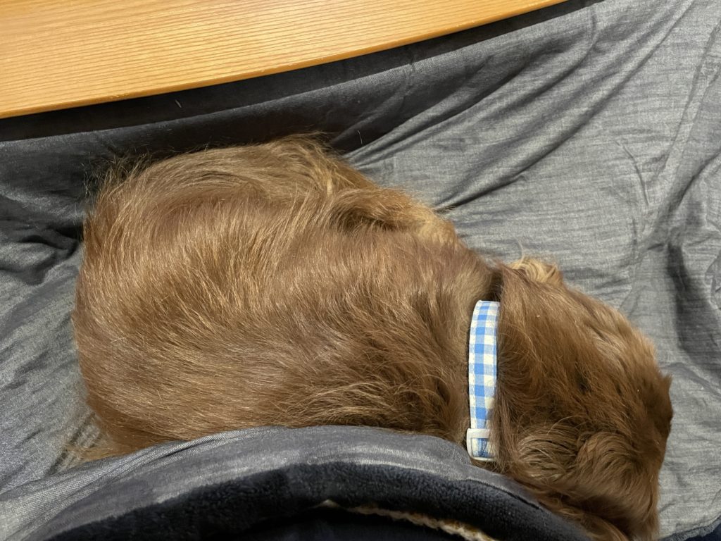リビングのこたつに入って作業をしていたら、うちのワンコが膝の上で気持ち良さそうに寝ちゃってます。出たくても出られない…